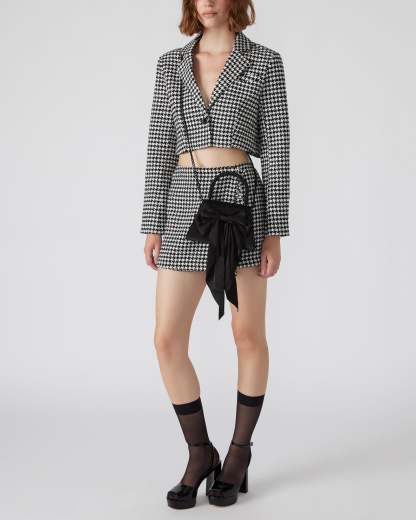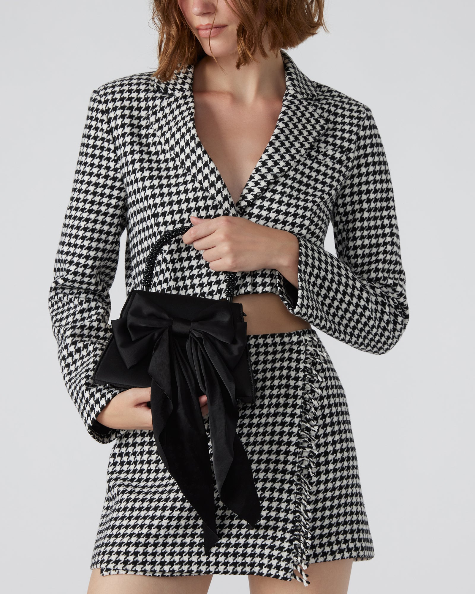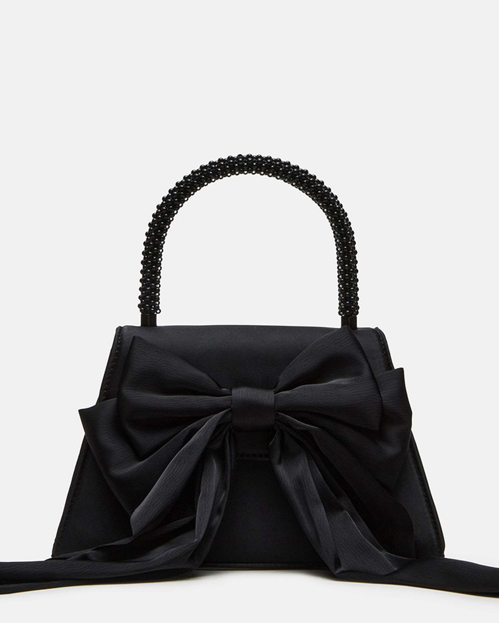 Introducing the sophisticated COSETTE bag. Expertly crafted with smooth satin and a beaded top handle, this elegant bag features a long satin bow and a structured top handle for a touch of glamour. The interior back slit pocket and detachable chain strap add practicality to its angled, trapezoid silhouette. Perfect for any formal occasion, this bag is a must-have for the style-conscious individual.