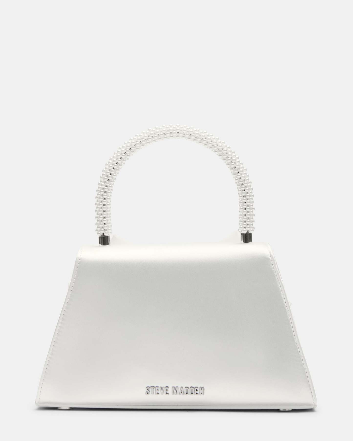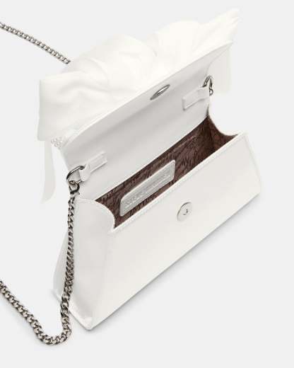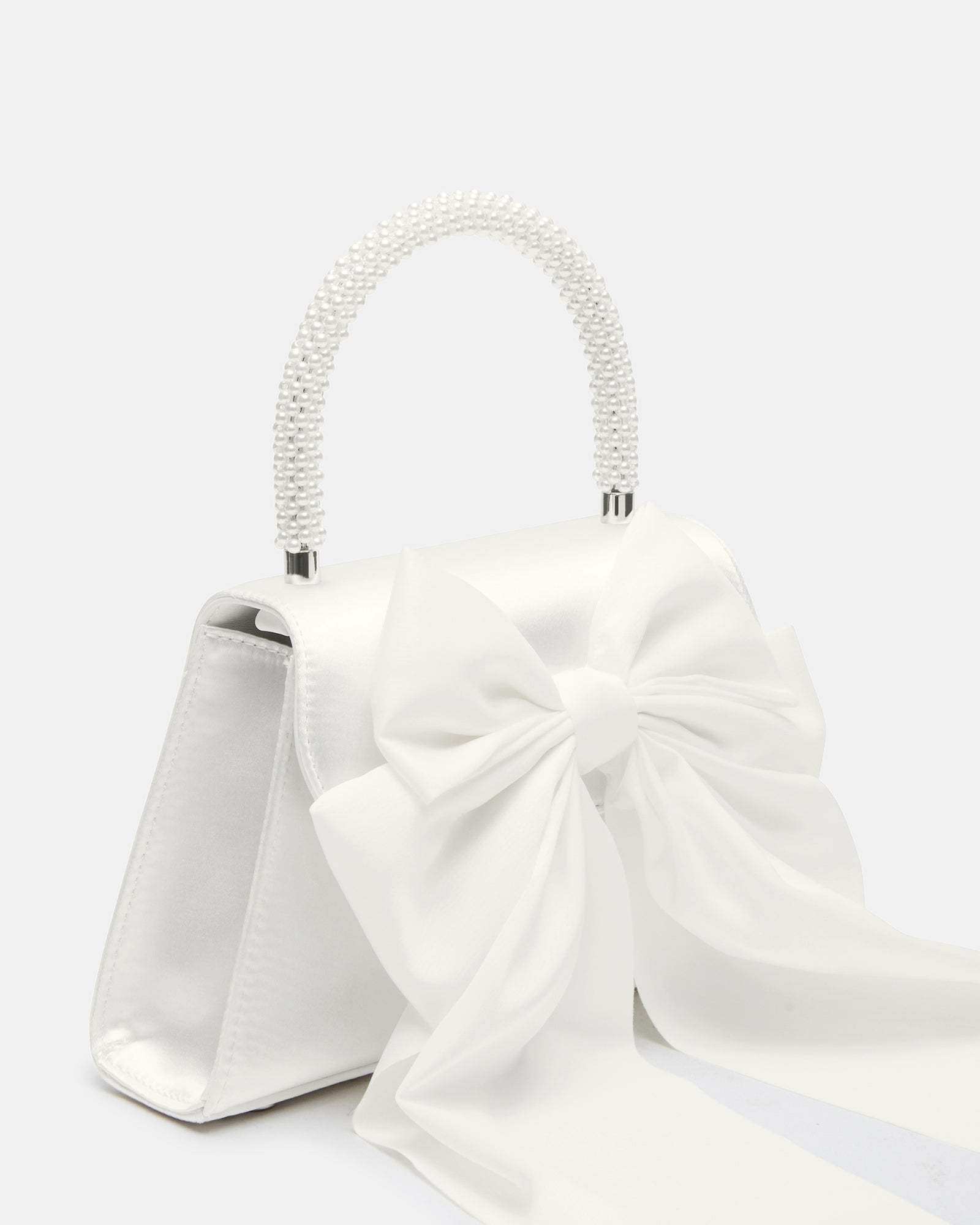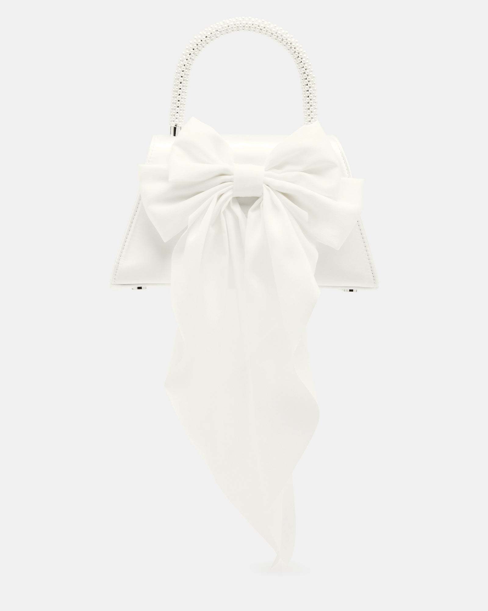 Introducing the sophisticated COSETTE bag. Expertly crafted with smooth satin and a beaded top handle, this elegant bag features a long satin bow and a structured top handle for a touch of glamour. The interior back slit pocket and detachable chain strap add practicality to its angled, trapezoid silhouette. Perfect for any formal occasion, this bag is a must-have for the style-conscious individual.