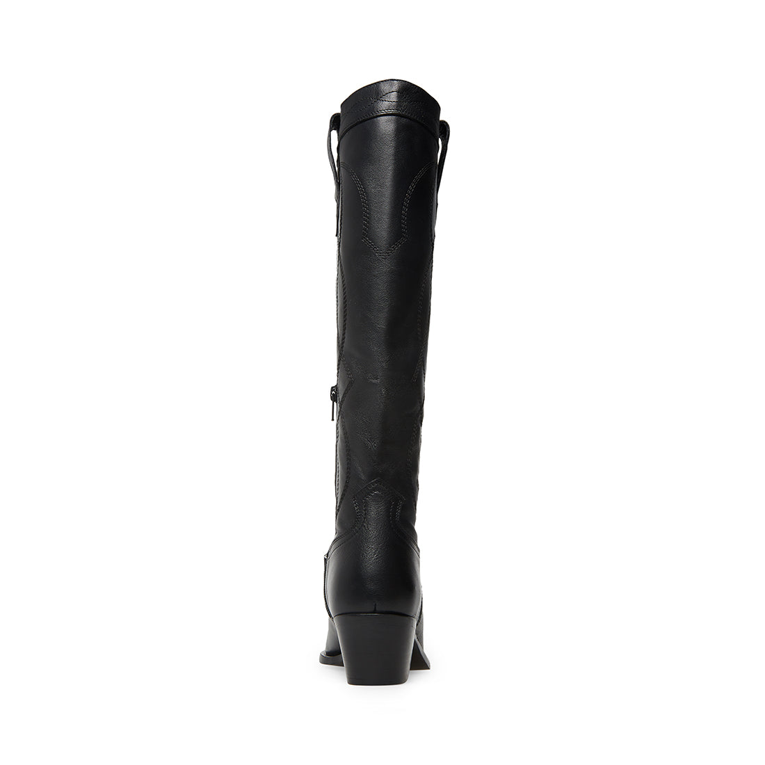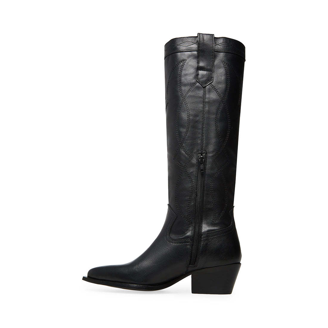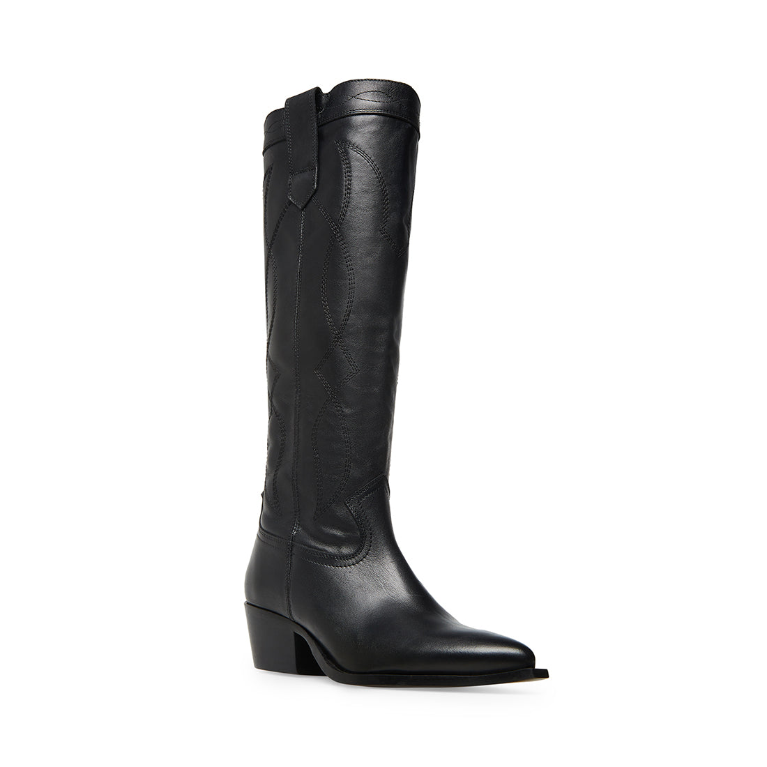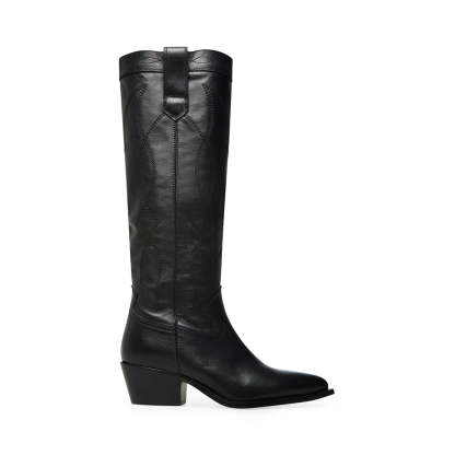 The FRAYDA boots take the pointed toe, stacked heel, and and decorative upper from classic cowboy boots and add the straight knee high shaft of a riding boot for a unique hybrid design.