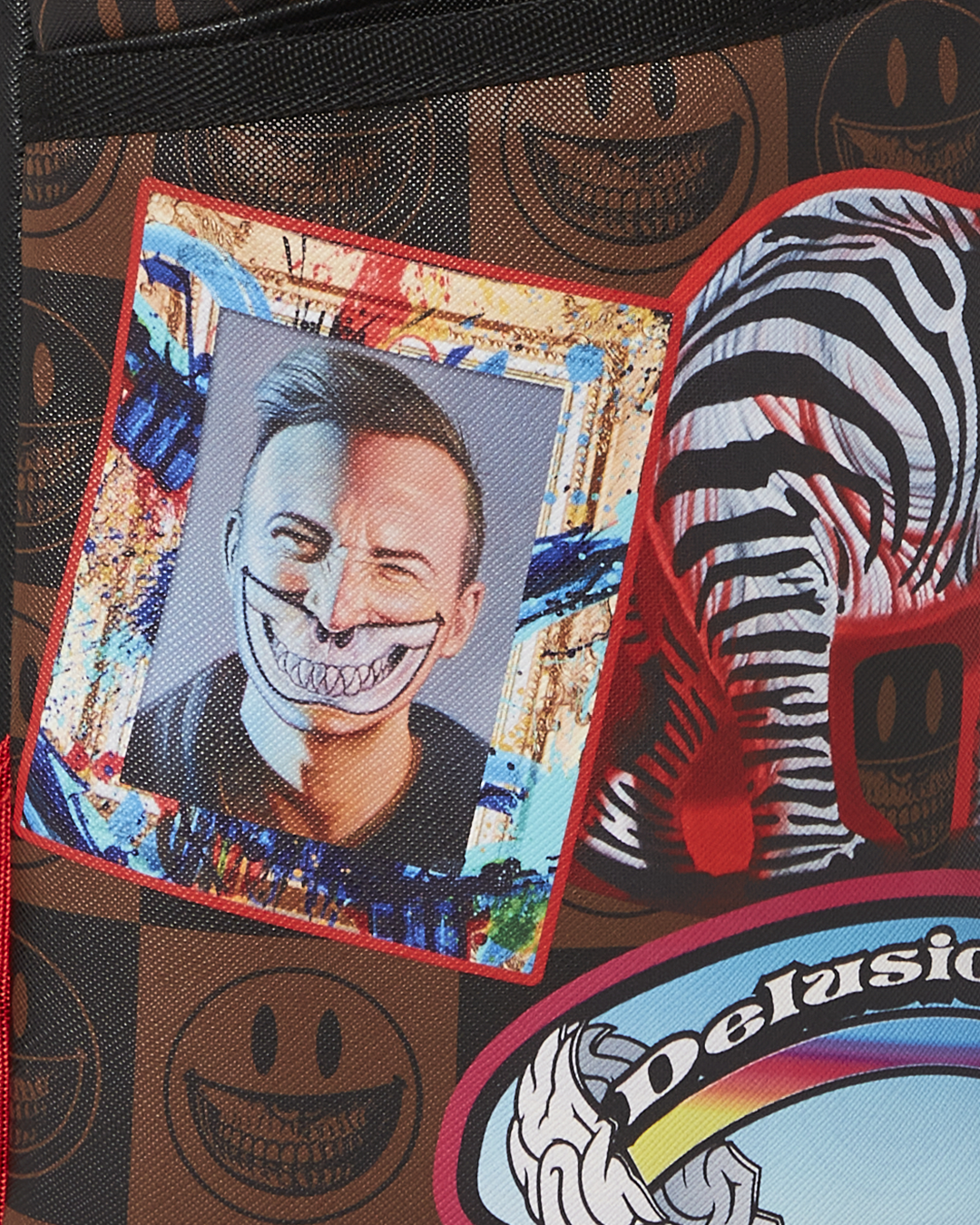 Dimensions: 18' x 6' x 11.5' • Front zipper pocket • Side pockets • Zippered Stash pocket • Separate velour sunglass compartment • Ergonomic mesh back padding • Adjustable Straps for custom sizing • Gold zippers with metal hardware • Metal 'Sprayground Authentic' badge • Slide through back sleeve connects to carry-on luggage to free your hands