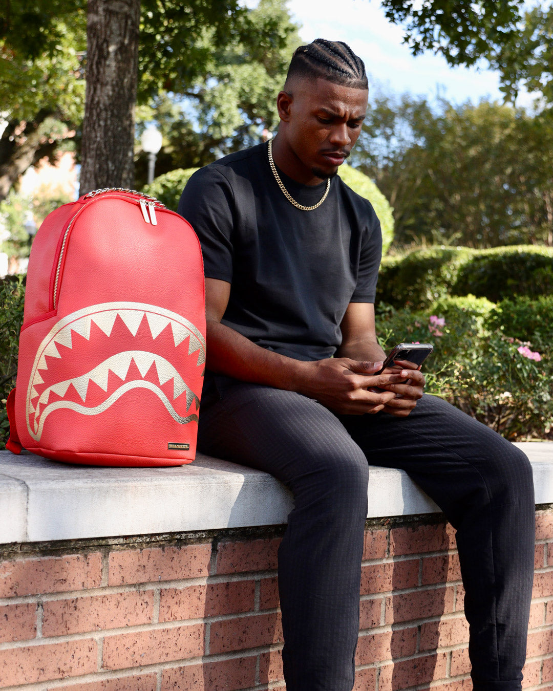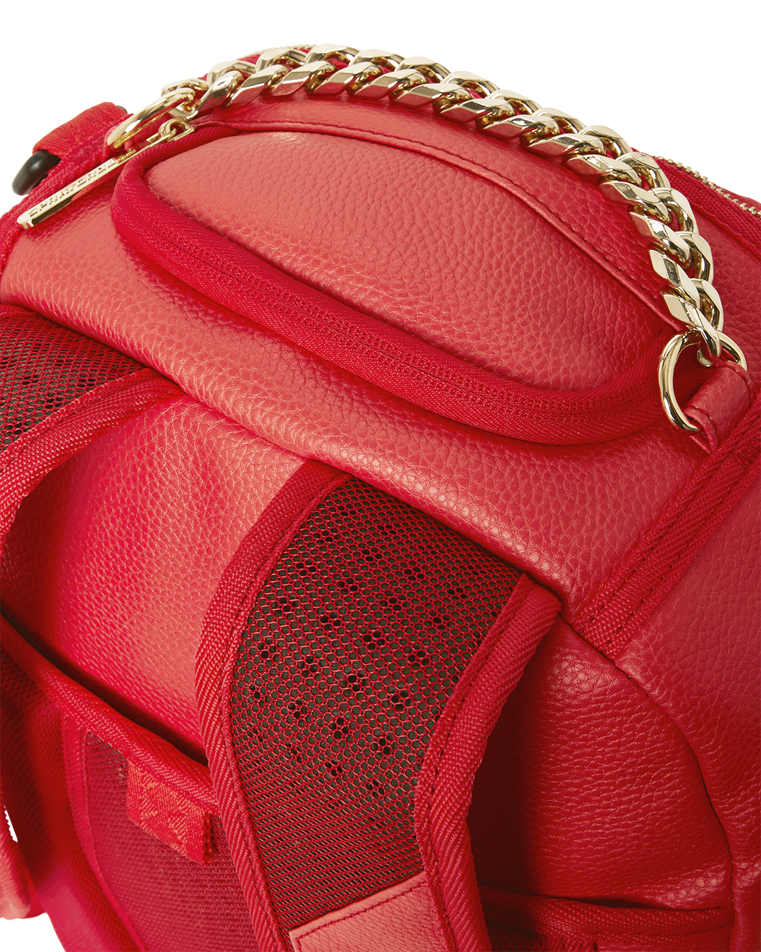 Dimensions: 18' x 6' x 11.5' • Front zipper pocket • Side pockets • Zippered Stash pocket • Separate velour sunglass compartment • Ergonomic mesh back padding • Adjustable Straps for custom sizing • Gold zippers with metal hardware • Metal 'Sprayground Authentic' badge • Slide through back sleeve connects to carry-on luggage to free your hands