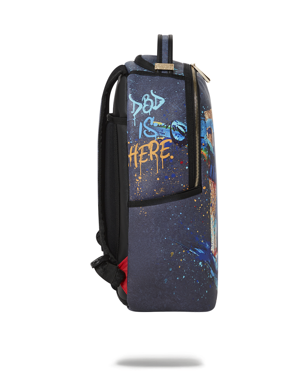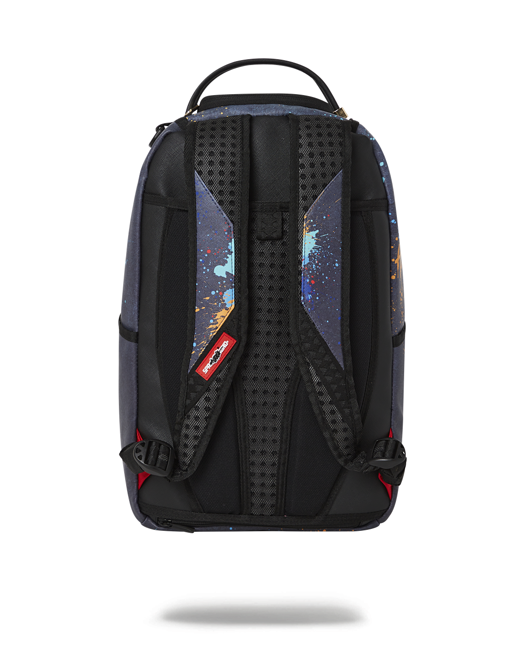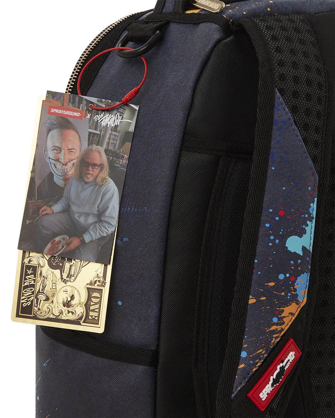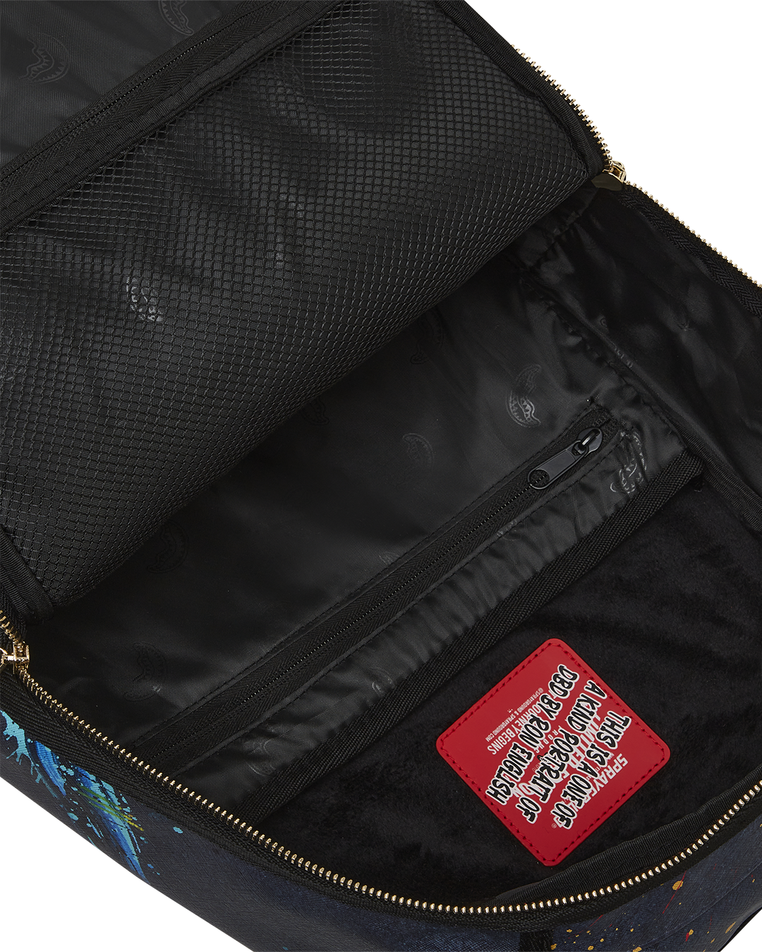 Dimensions: 18' x 6' x 11.5' • Front zipper pocket • Side pockets • Zippered Stash pocket • Separate velour sunglass compartment • Ergonomic mesh back padding • Adjustable Straps for custom sizing • Gold zippers with metal hardware • Metal 'Sprayground Authentic' badge • Slide through back sleeve connects to carry-on luggage to free your hands