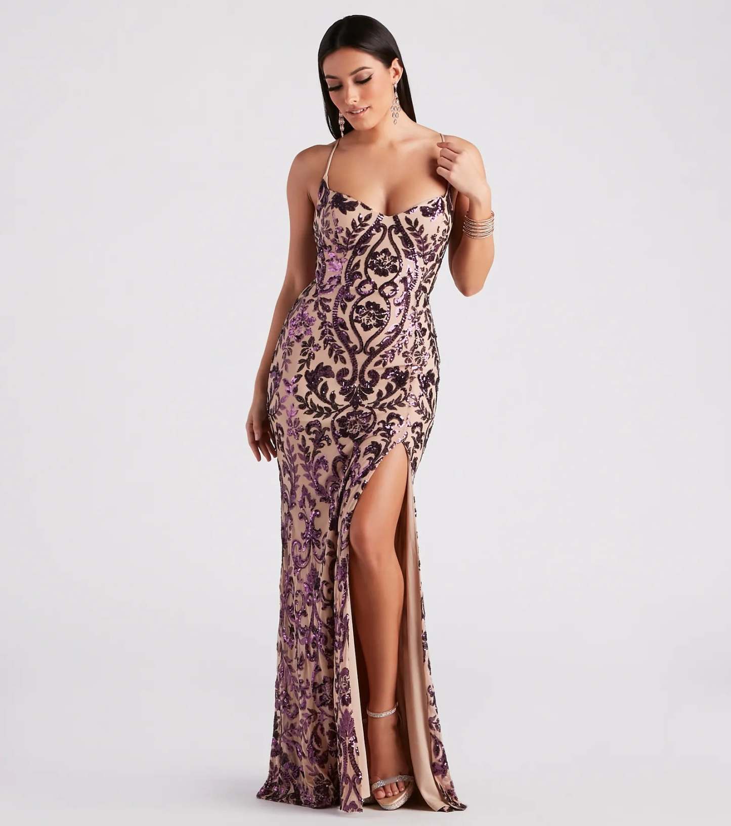 Gorgeous sequins make the Lori formal dress a sexy standout! With an alluring strappy lace-up back, high front slit for movement, and a striking form-hugging silhouette.