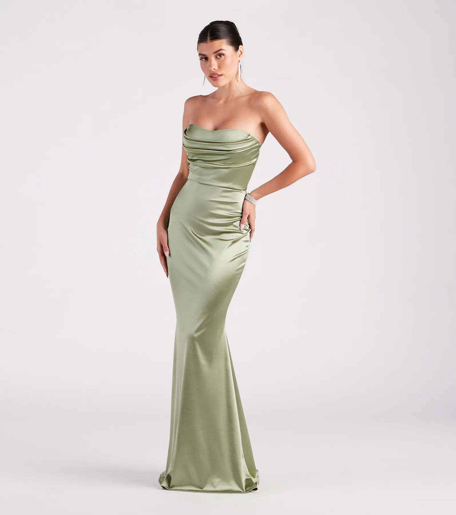 Make it an elegant entrance in the Priscilla formal satin dress with a curve-hugging mermaid silhouette and floor-sweeping hem for dramatic flair.